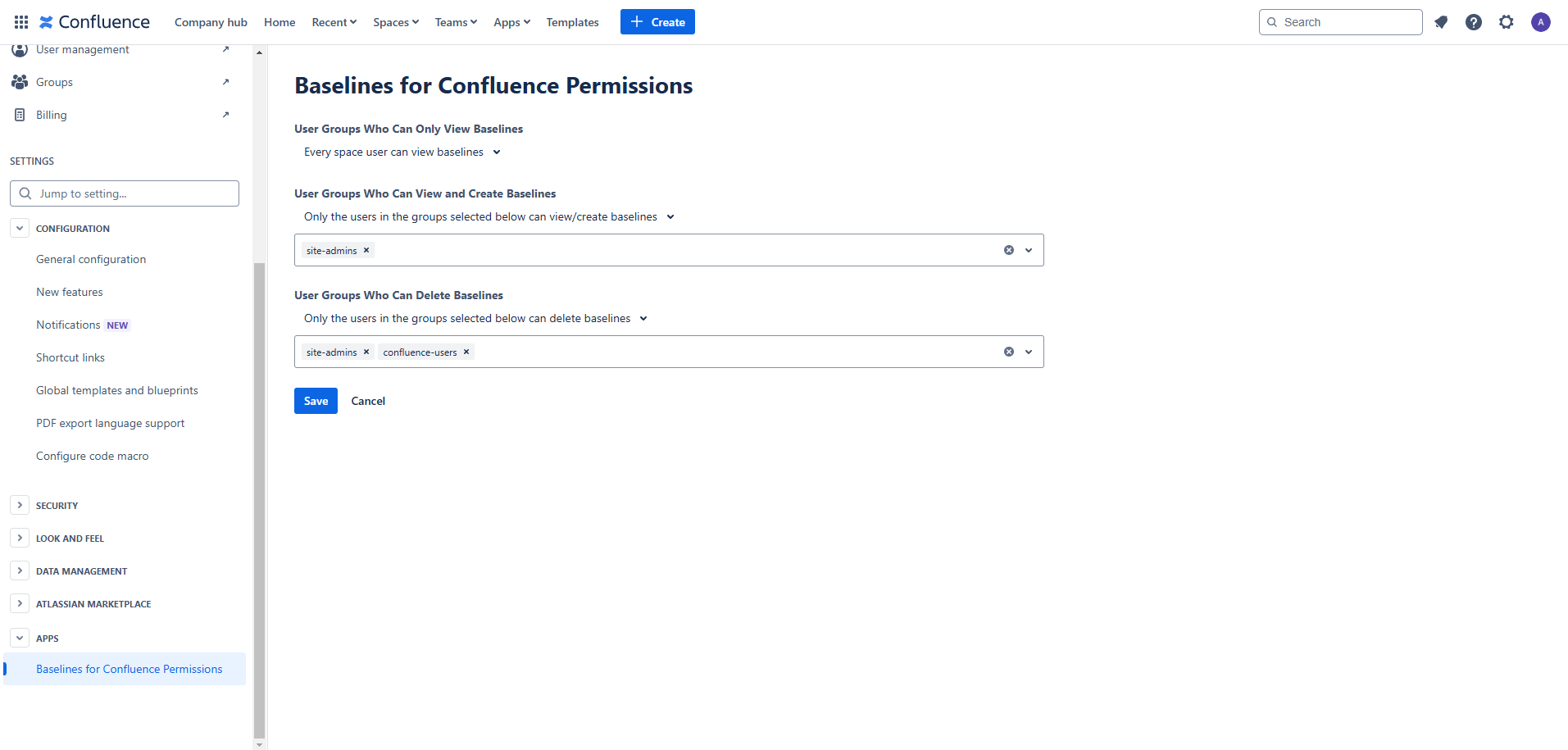 - Go to Confluence Administration >> Apps >> Baselines for Confluence Permissions page.