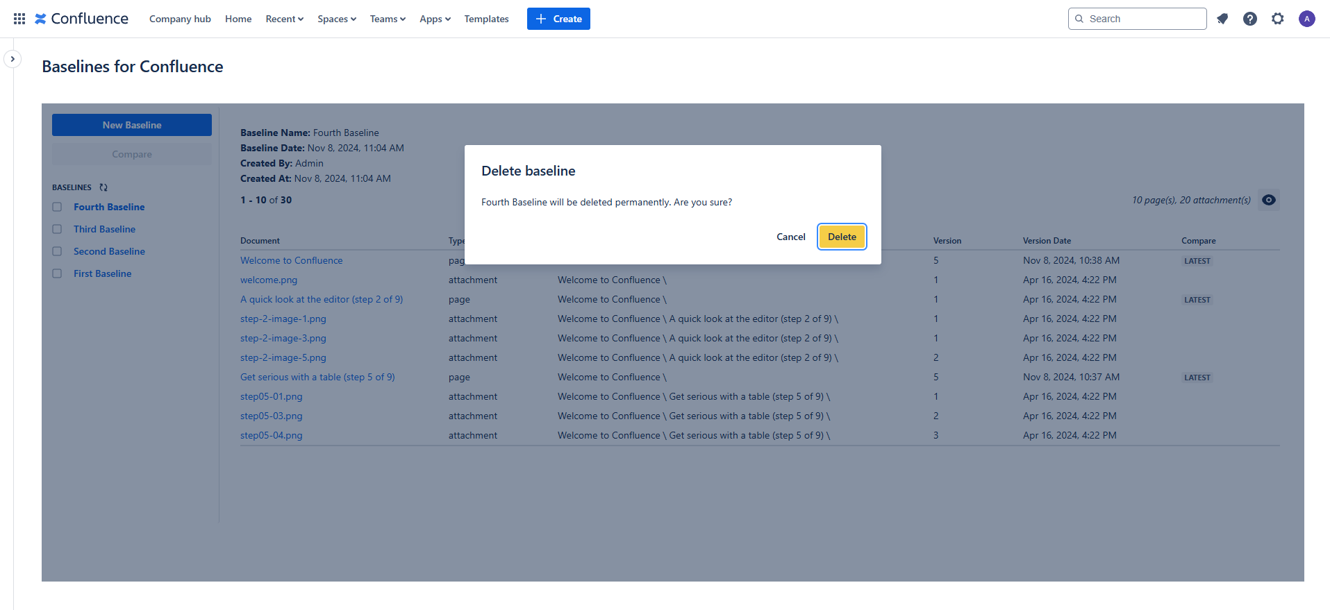 - Since the baseline contains only links to item(page, blog-post and attachment) versions, not actual items themselves, deleting a baseline does not delete items. Your items will remain in the space.