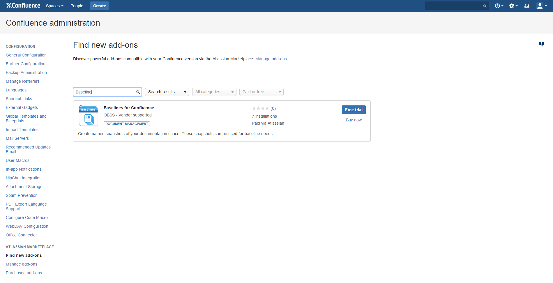 Click Try free to begin a new trial or Buy now to purchase a license for Baselines for Confluence.