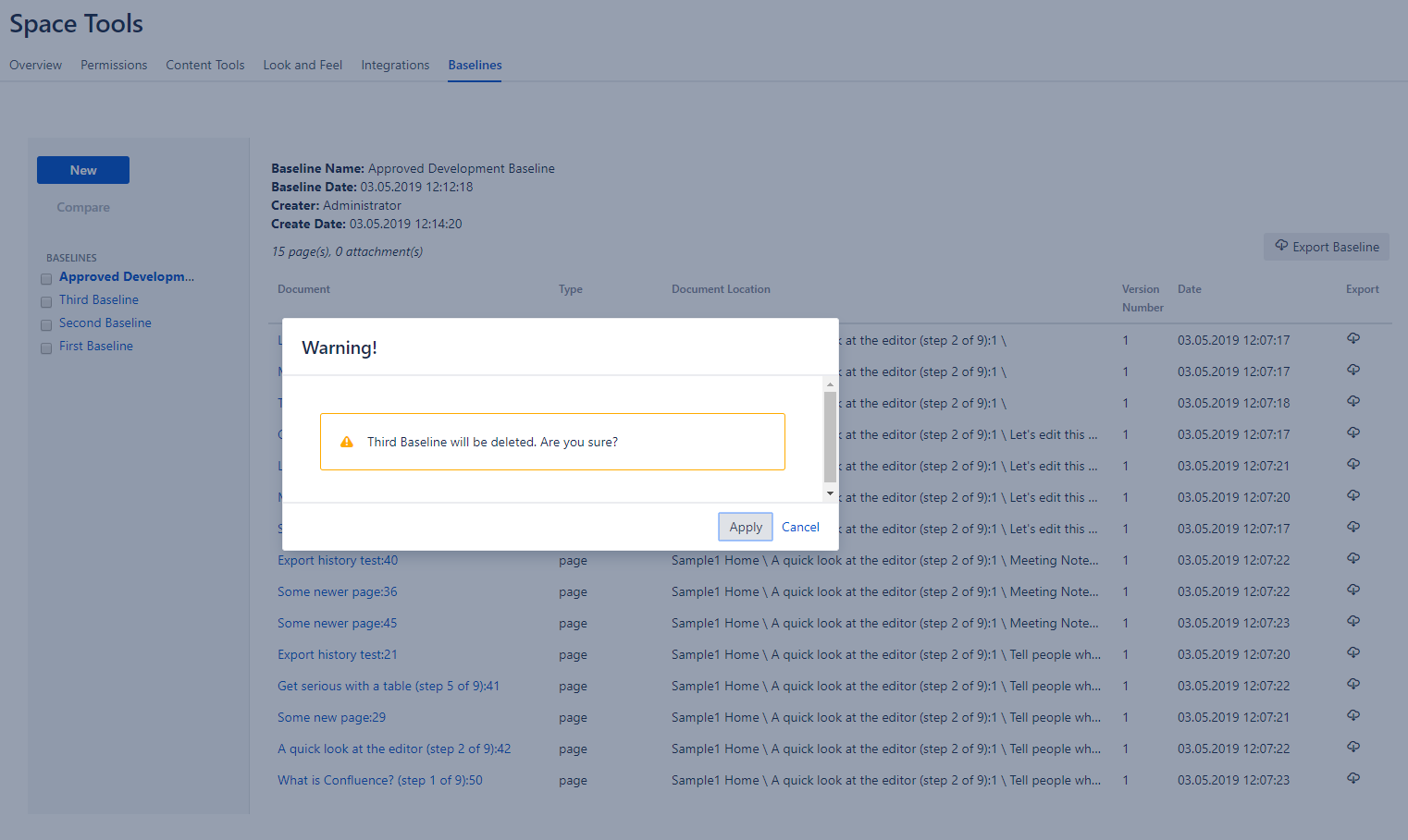 - Click "Apply" if you are sure that you want to delete the baseline.