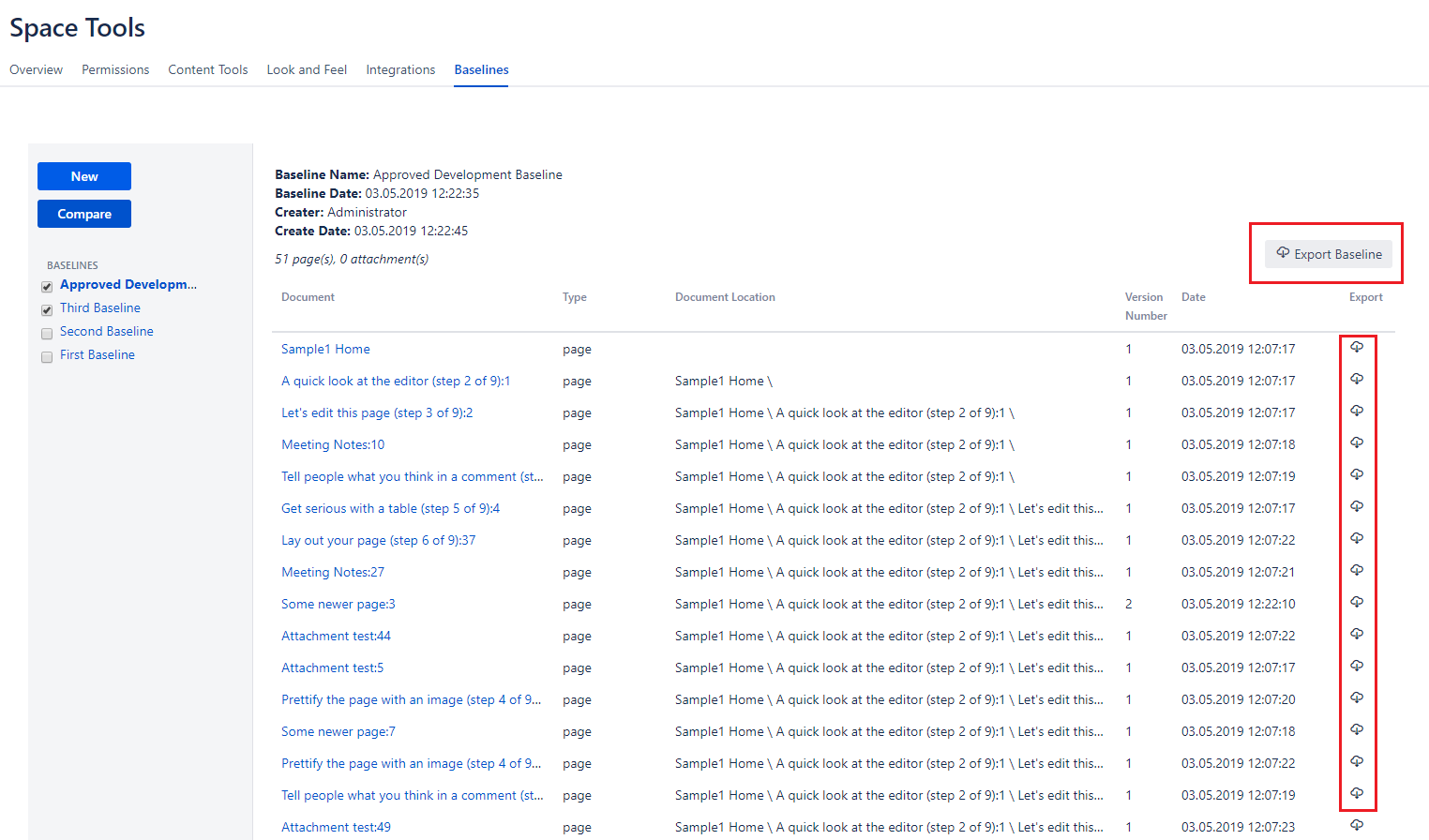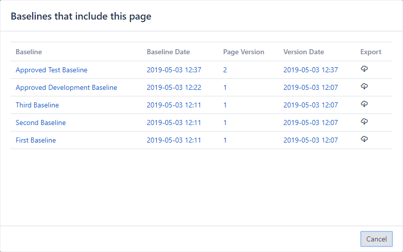 • Click the export icon at the end of each row to export the version of that page included in that baseline.