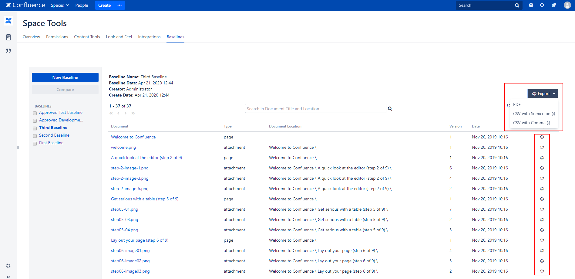 - Click the export icon at the end of each row to export the version of that page included in that baseline.