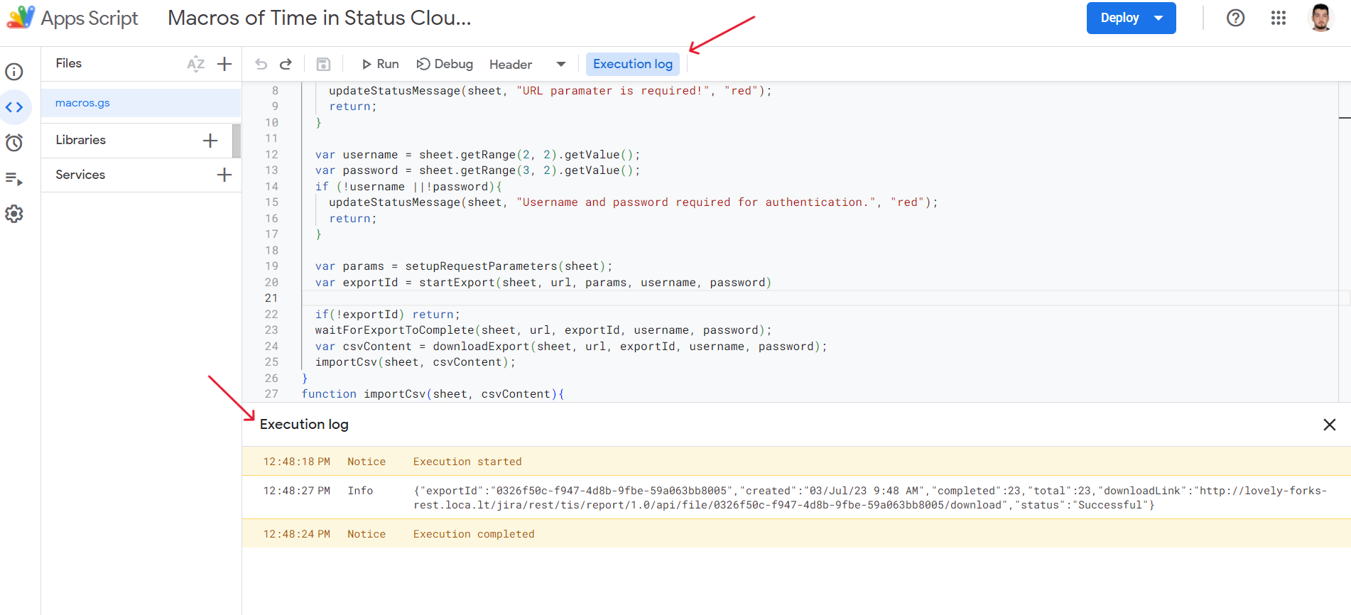 4 - Finally, get screenshots of messages displayed in the 'Execution log' section at the bottom of the page. Please note that there might be many messages so you might need to take multiple screenshots to cover them all.