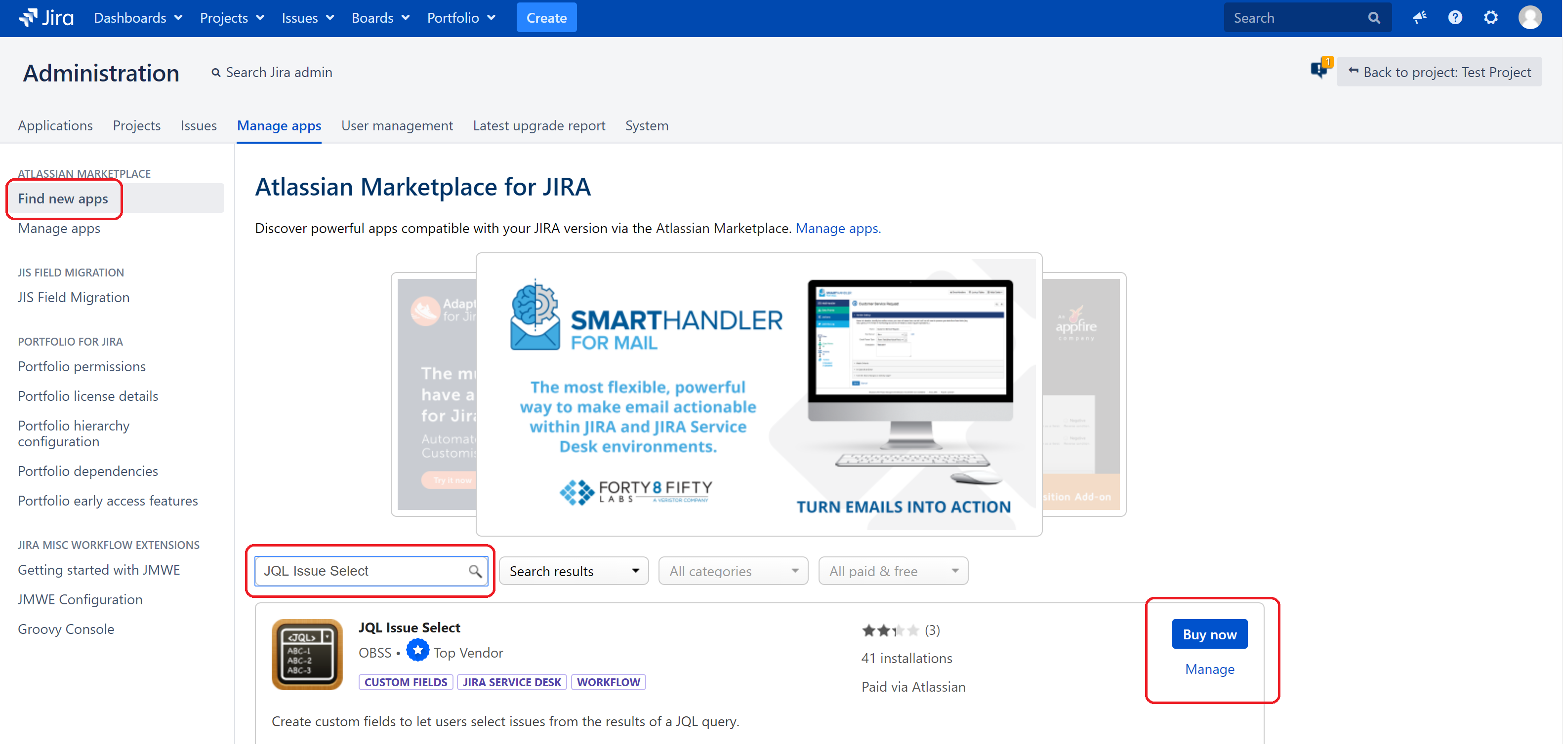 - Enter "JQL Issue Select" in the Search the Marketplace box.