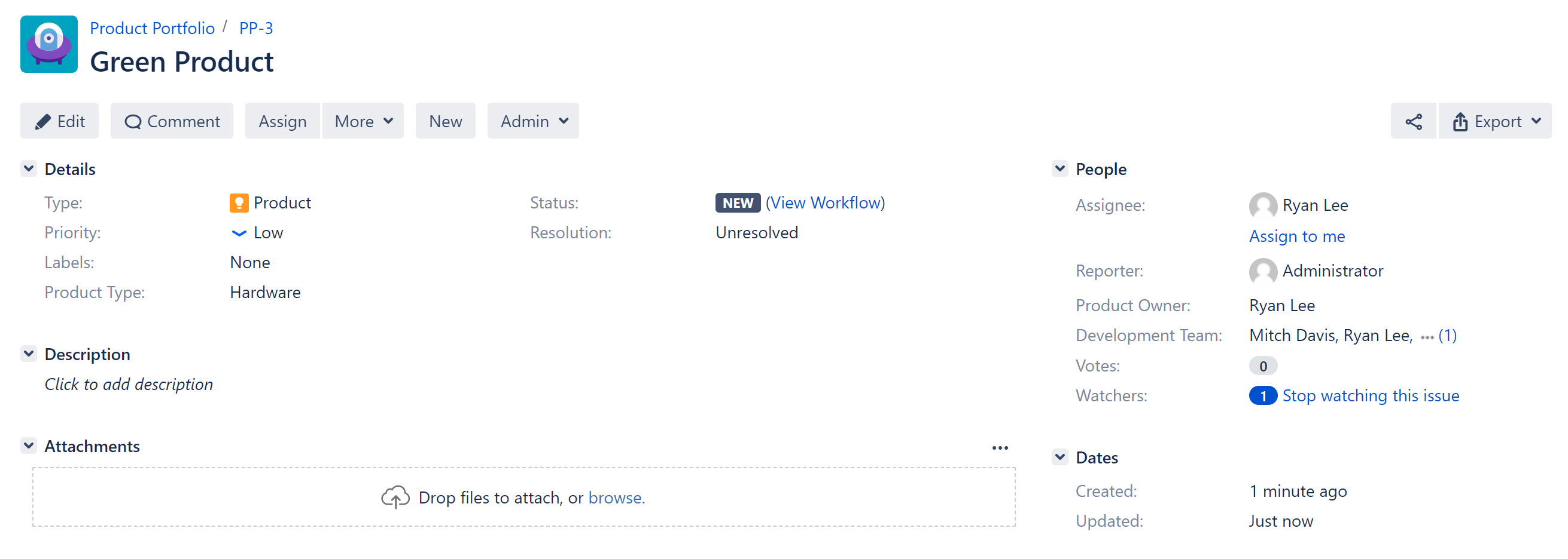 Here you can see Product Type, Product Owner, Development Team fields are created as attributes of your product card.