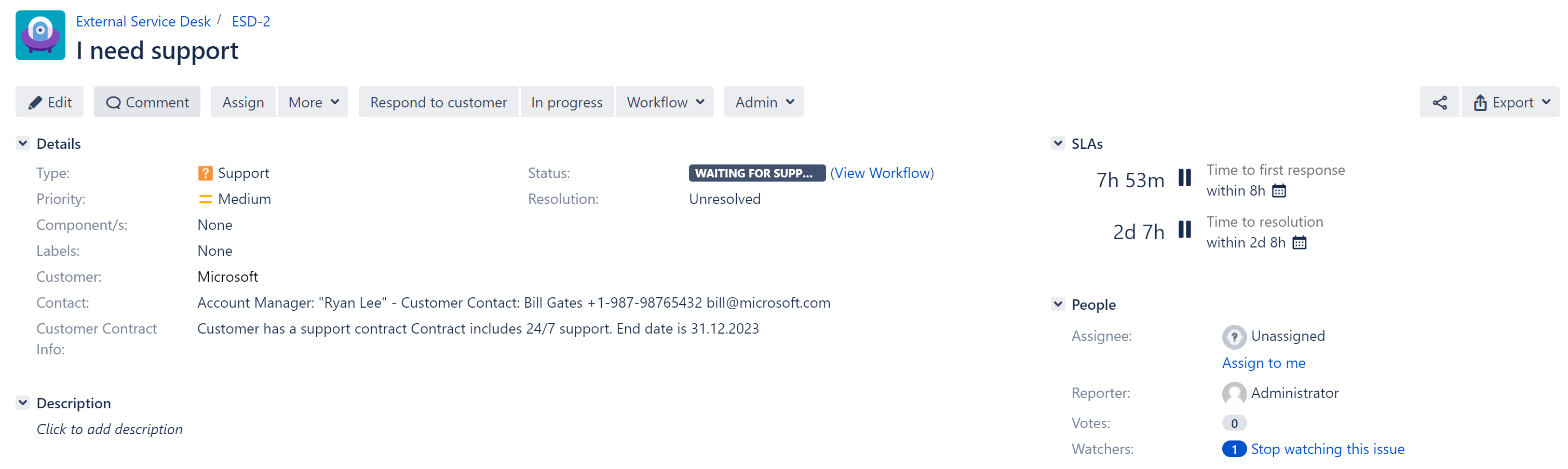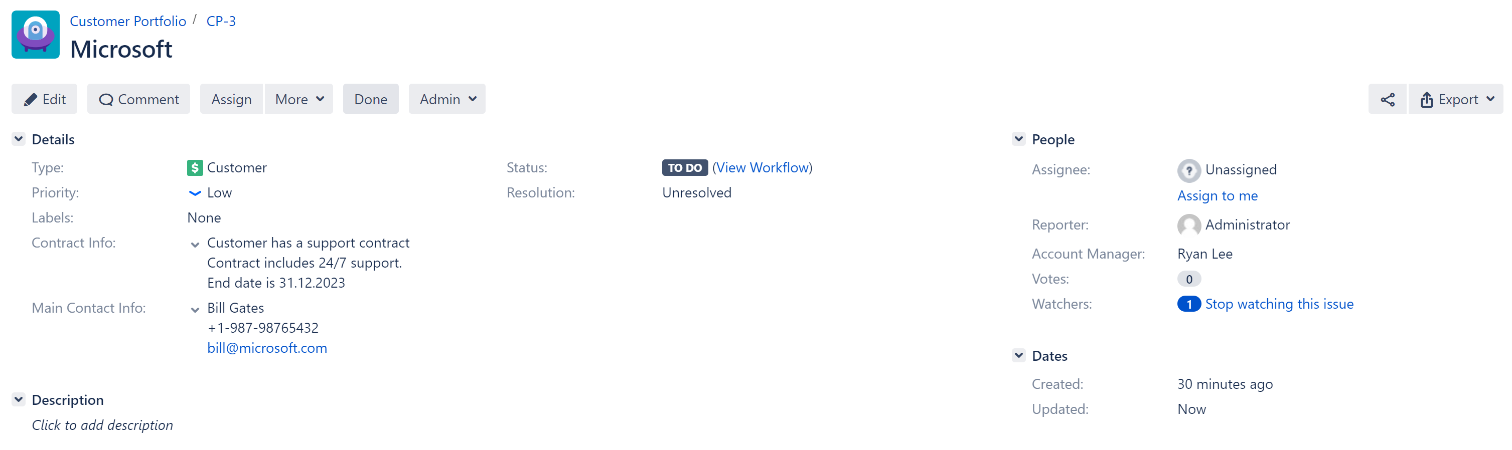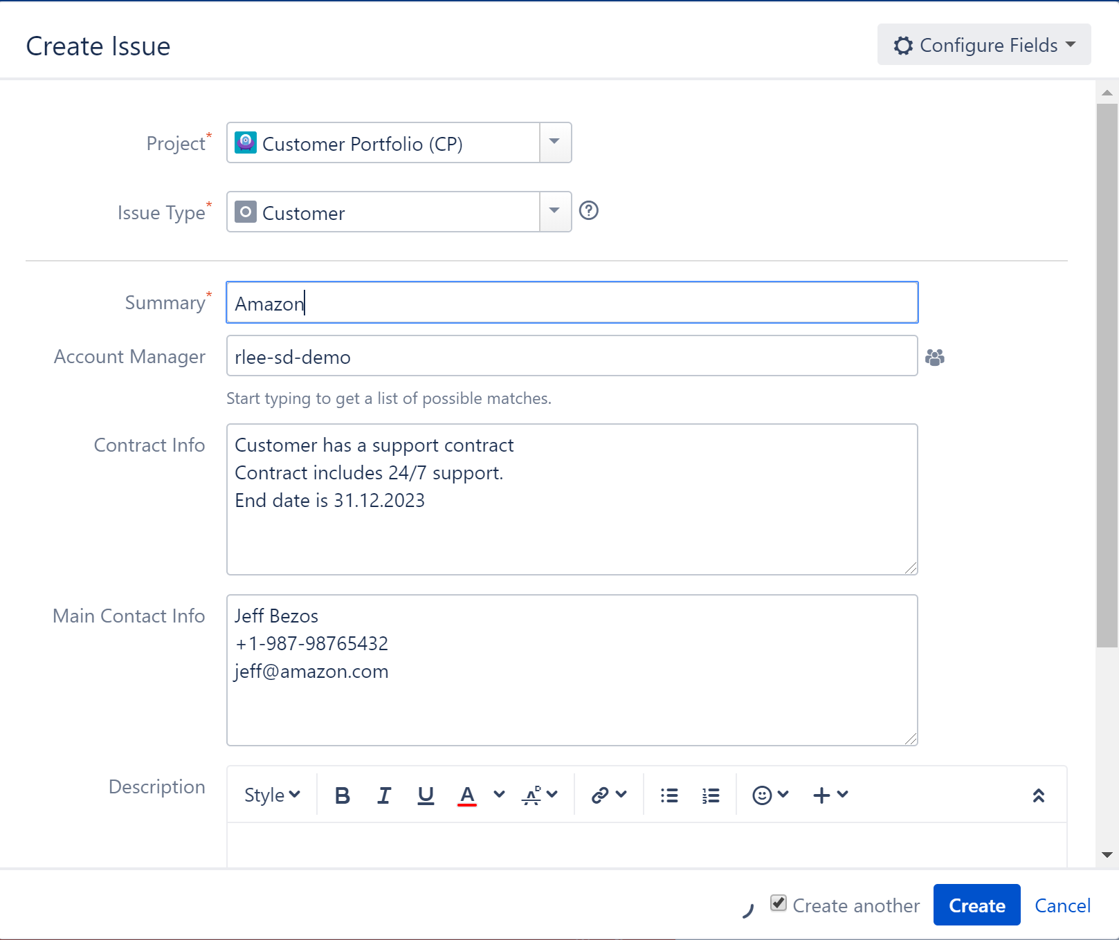 You can see that the the Contact and Customer Contract Info fields are shown on the issue with a text calculated based on the customer selection made in create screen. When you change the customer, Contact and Customer Contract Info fields will also change.