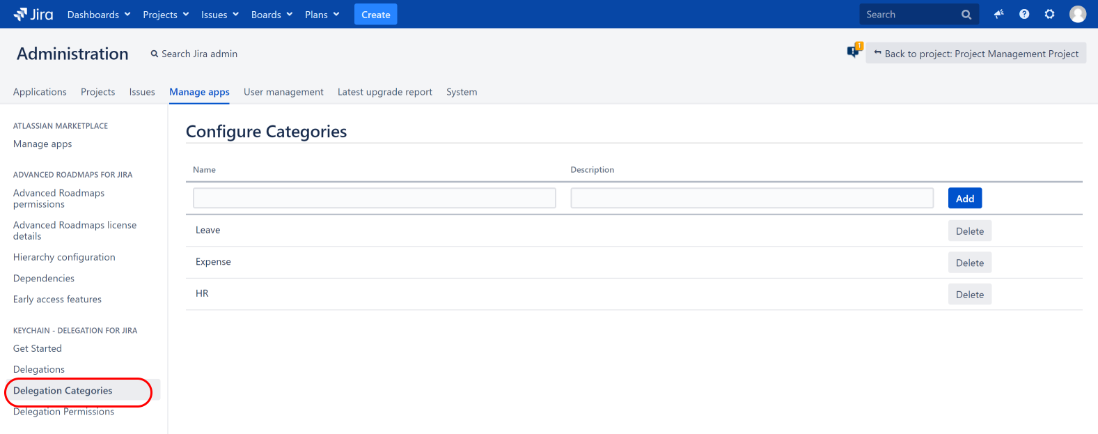 The Delegation Categories page allows you to define the master list of delegation categories which then can be used while delegating permissions or configuring Jira Components.