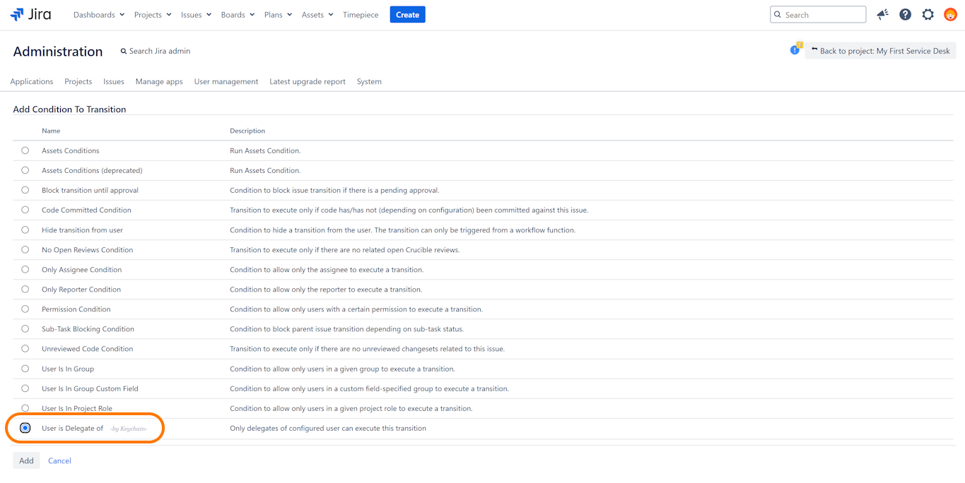 • You see that the User is a Delegate of condition can be configured to allow the delegates of not only the Assignee, but also other users, project roles, groups, etc.