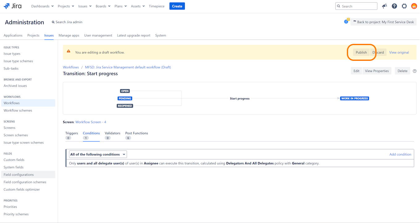 • Initially, in this sample transition below, the workflow is configured to allow only the assignee of the issue to execute the transition.