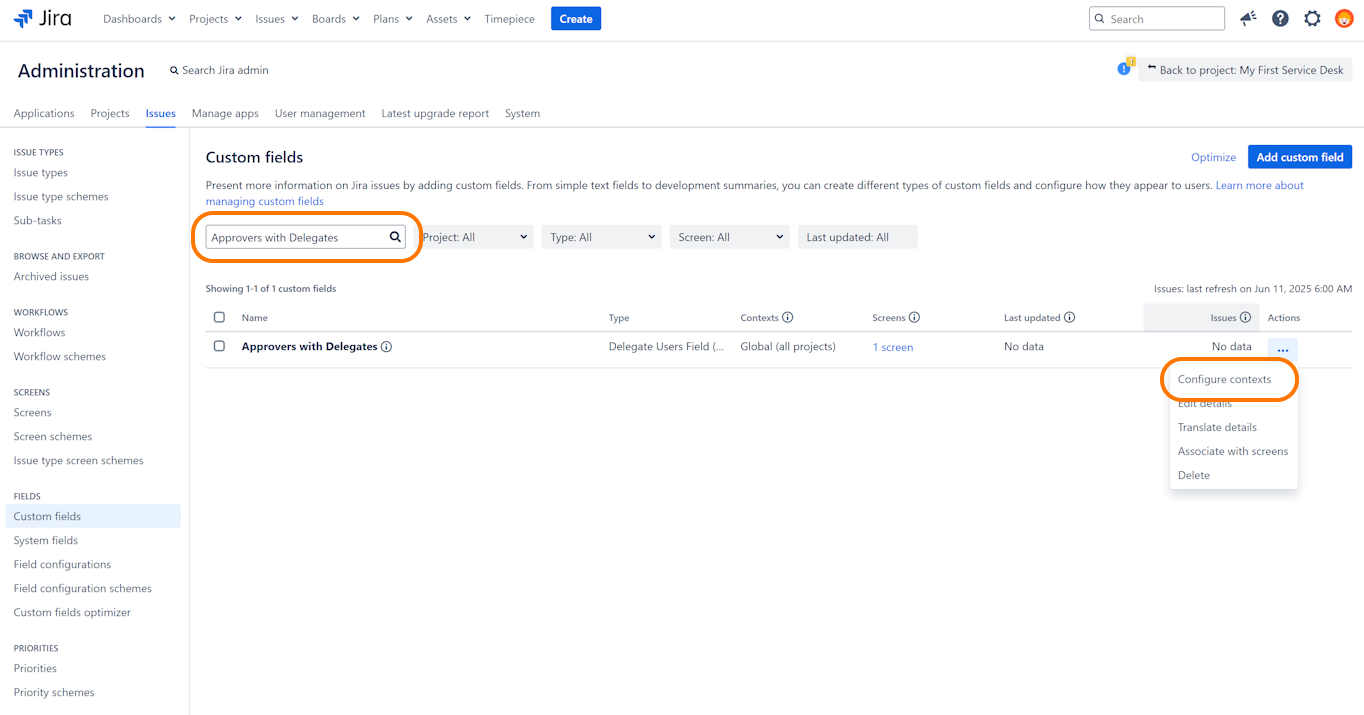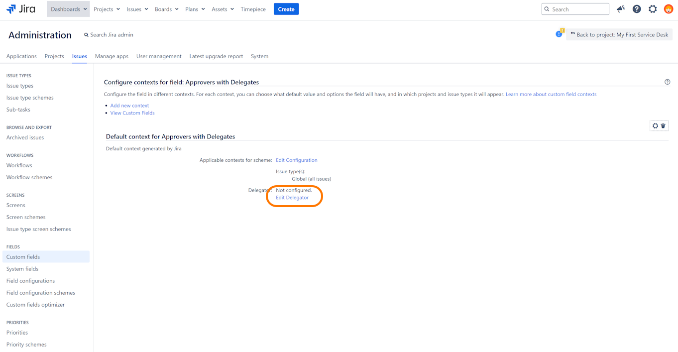 - Please note that you don't need to add this field to a screen for the approval flow to work. Adding this field to a screen lets you see the names of approvers and their delegates on issue view screens.