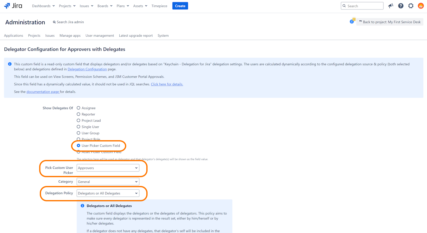 - For the Get Approvers From option, check the User picker field checkbox and select the new Approvers with Delegates custom field.