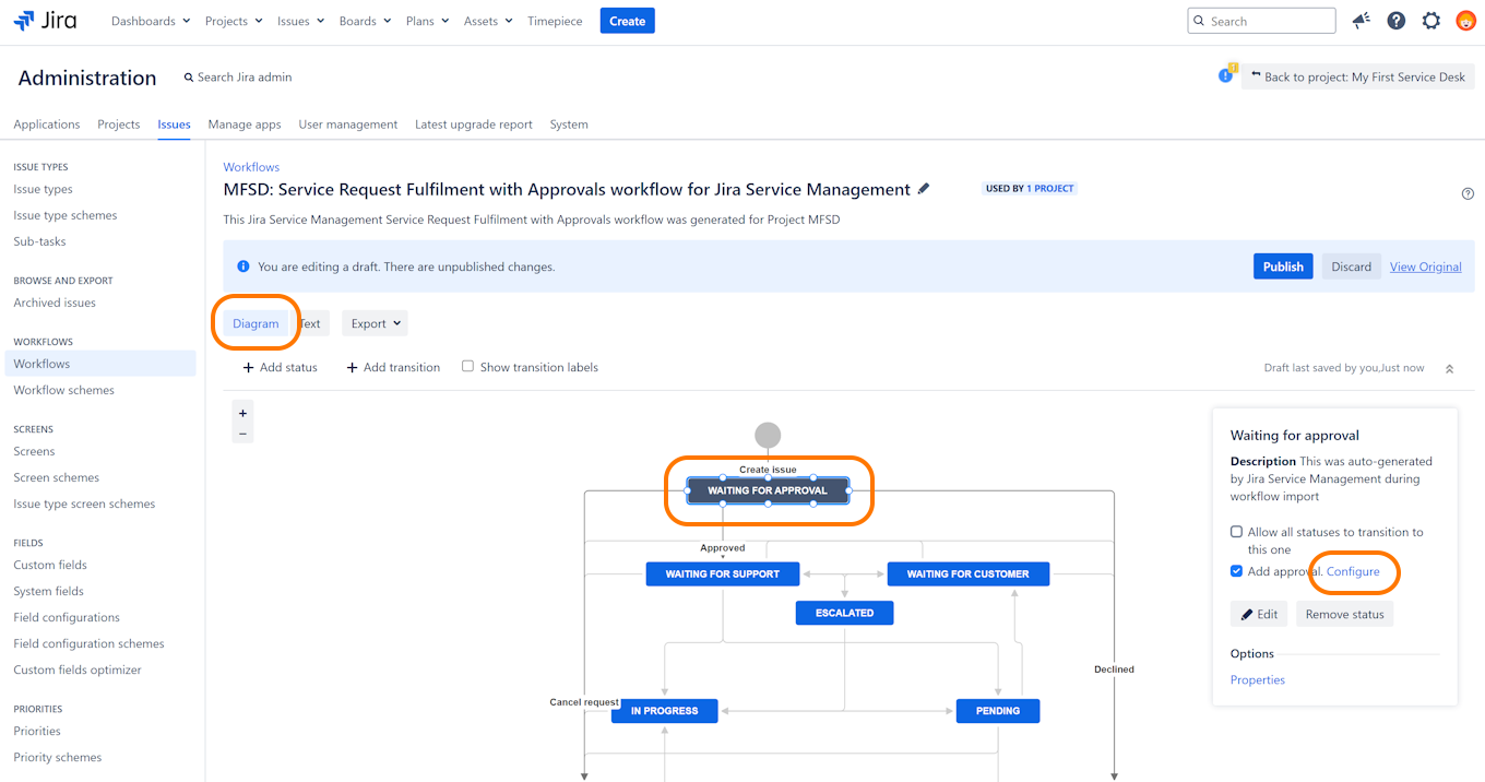 - To configure the request type to use this field as the source of approvers, go to Jira Admin >> Issues >> Workflows page and locate the workflow used by your request type.