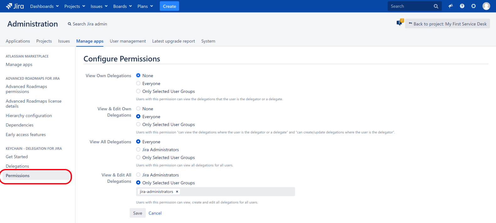 The Permissions page in Jira admin section allows you to define user permissions for configuring Keychain - Delegation for Jira.