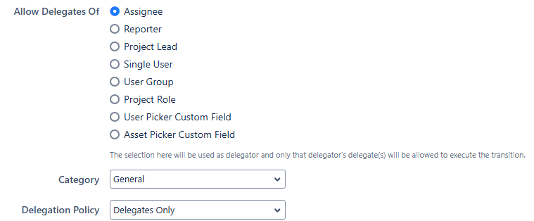 If configured for Assignee, the field will take the assignee of the current issue as Delegator and will only allow the Delegates defined for that user to execute the transition.