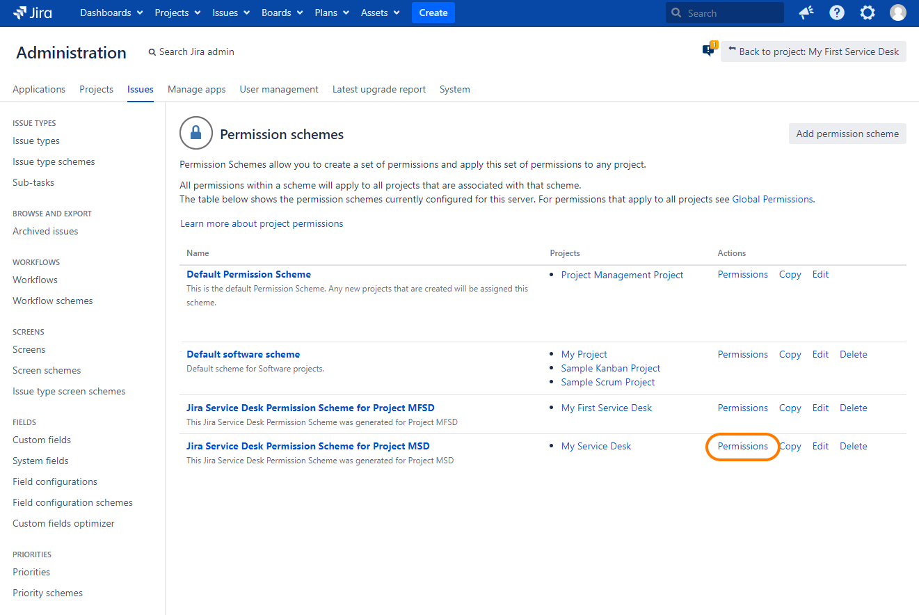 - Go to Jira Admin >> Issues >> Permission Schemes page. Find the permission scheme used by your project.