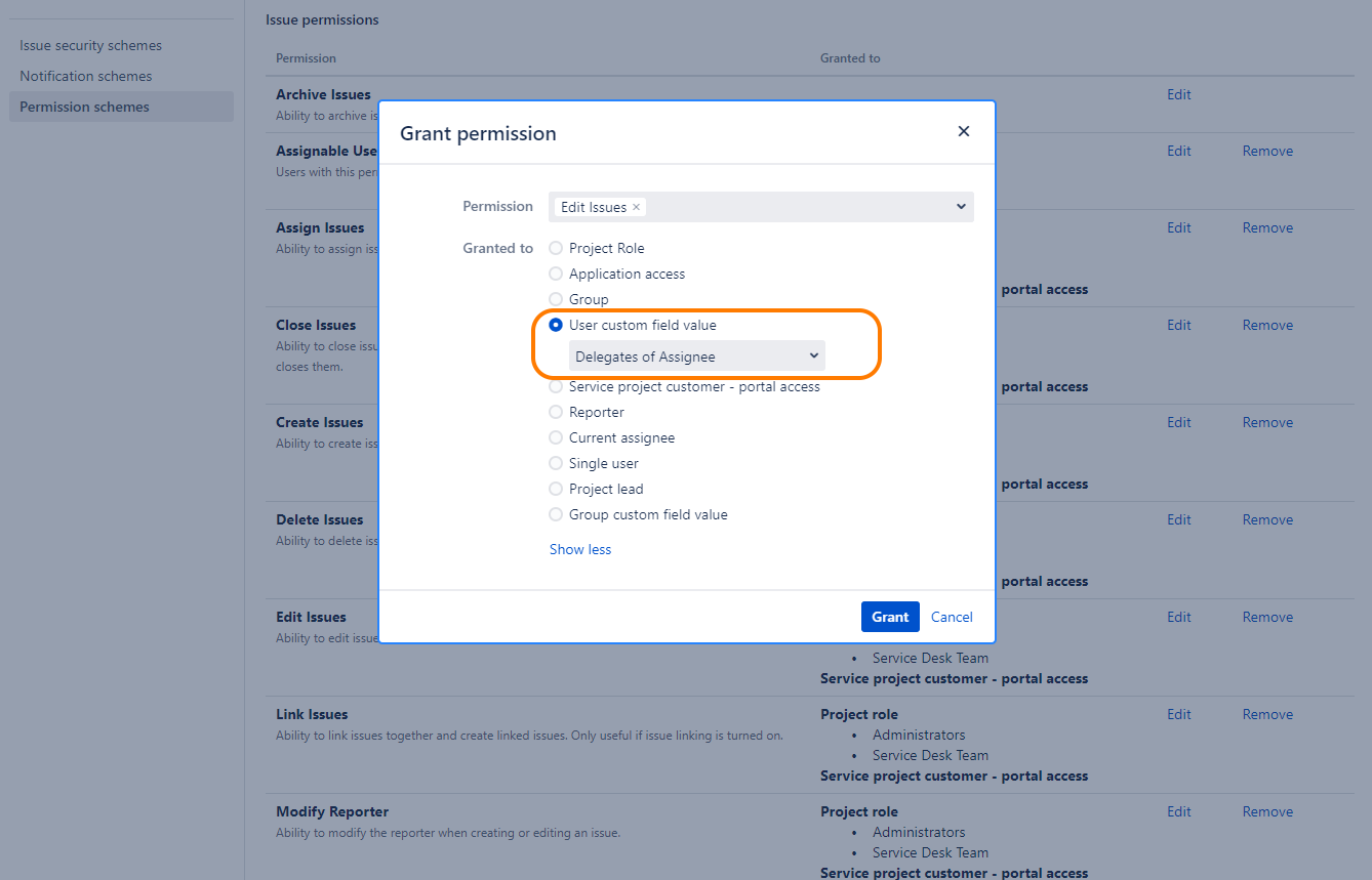 - When the Grant Permission dialog opens, select the User Custom Field Value option and select Delegates of Assignee field.