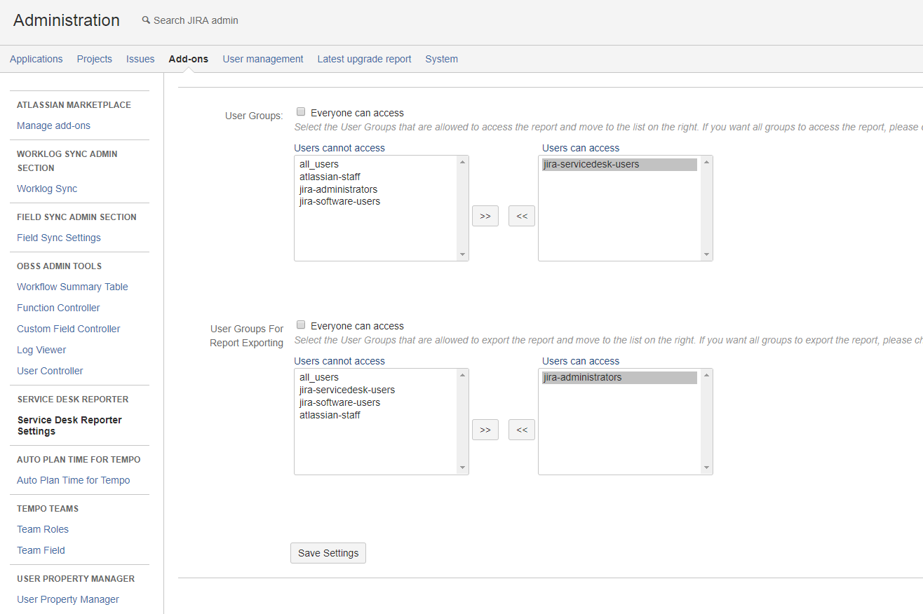 The configuration page for Service Desk Reporter is located under Administration >> Add-ons >> Service Desk Reporter Settings.