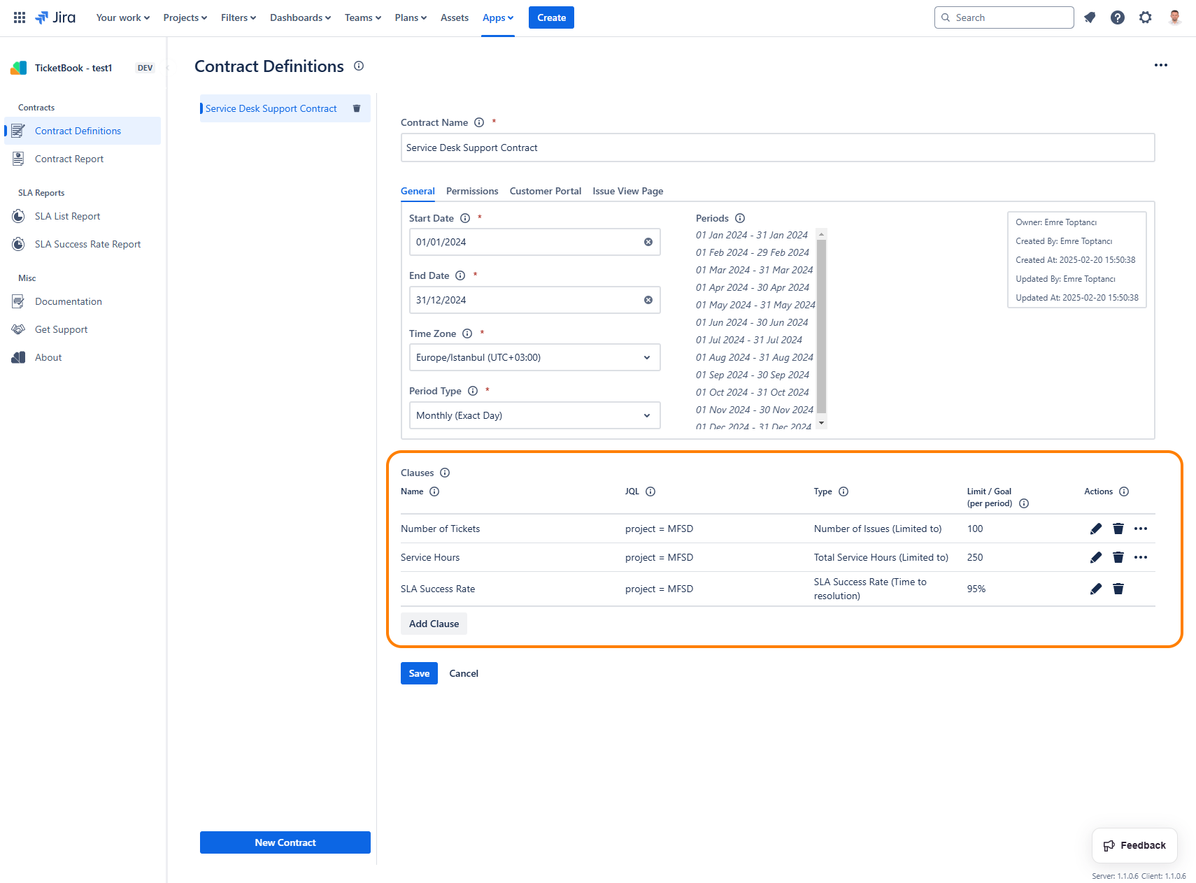 The "Number of Issues" and "Total Service Hours" clauses can also be configured as Unlimited. In that case, the Contract Report will just calculate the total number of issues created or the total service hours logged and the periods will always be displayed as a success.