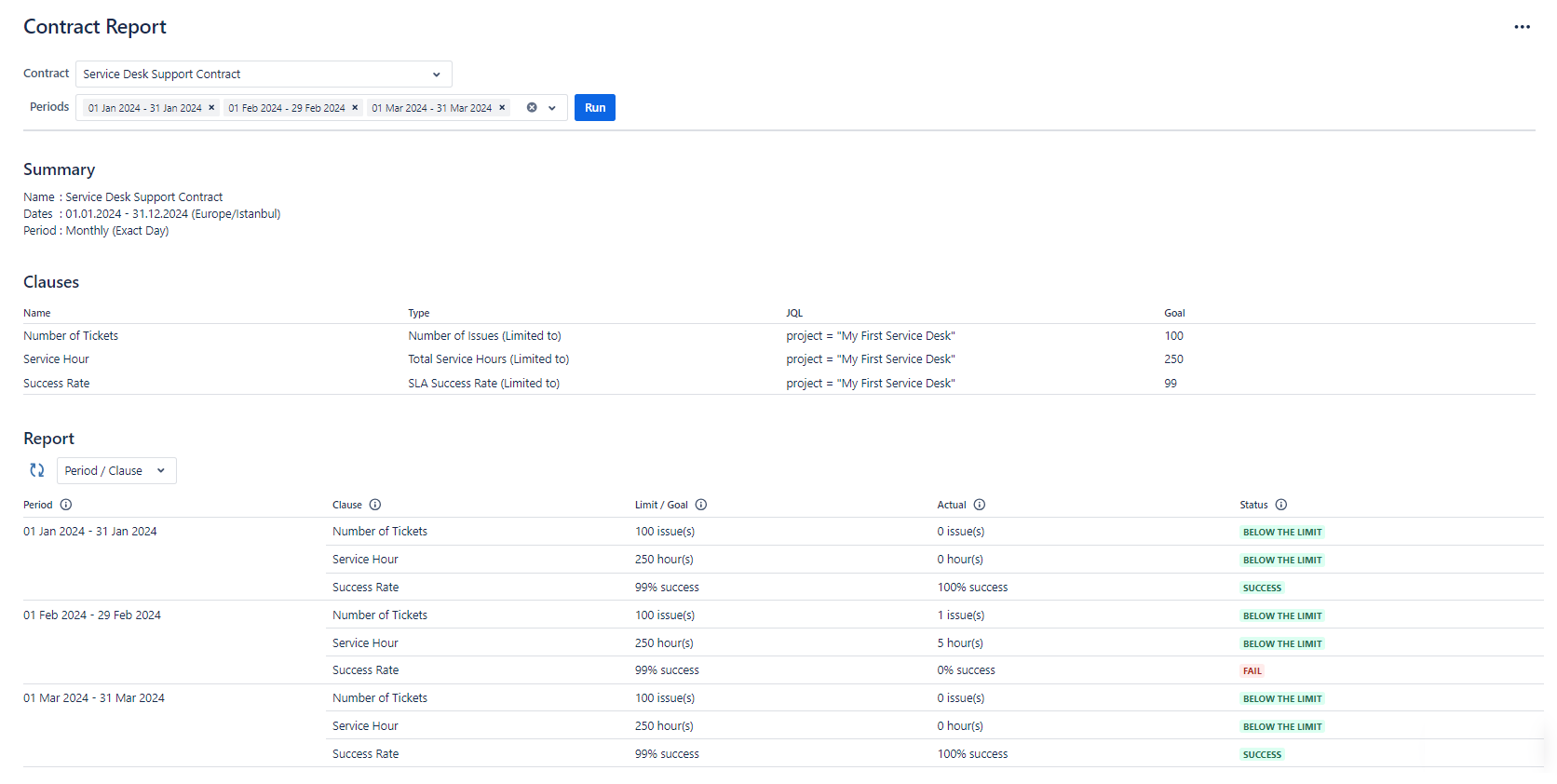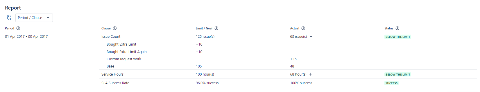 The "Actual" column displays the actual data for that clause, gathered from Jira issues. For "Number of Tickets" clauses, this is the number of tickets created in that period that matches the clause JQL. For "Total Service Hours" clauses, this is the total work logged onto issues created in that period that matches the clause JQL. For "SLA Success Rate" clauses, this is the number of issues with successful SLAs divided by the number of tickets created in that period that matches the clause JQL.