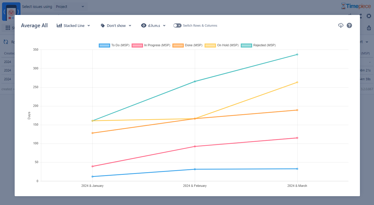 Timepiece report screen shows charts for individual report rows and an overall chart for aggregated reports.