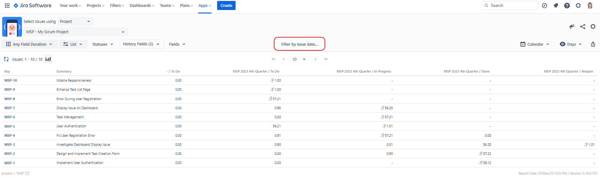 The date filter can be based on Created Date, Resolution Date or Update Date of issues.