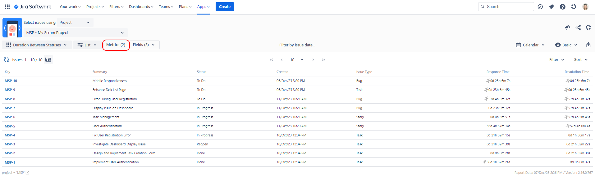 The Metrics button will be shown only when Duration Between Statuses report type is selected. This button opens a panel that allows you to define one or more metrics that will be used for Duration Between Statuses report.