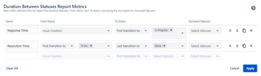 If your workflow allows it, your issues might visit the same status more than once. For those cases, the From Status and To Status selections allow you to start the metric at the First or Last visit to a status. If an issue visits a status only once, selecting first or last won't make a difference.