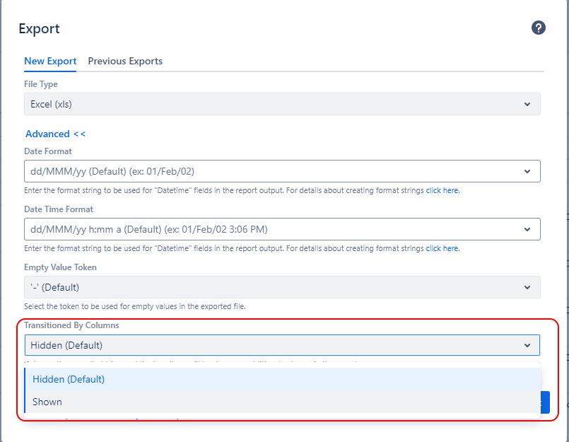 You can define an Empty Value Token here. Empty values in the report (for example, if an issue has never visited a status) will be represented by this token. The default value is a Hyphen ("-"). You may select one of the other options based on how you plan to use the exported file.