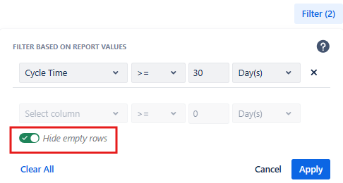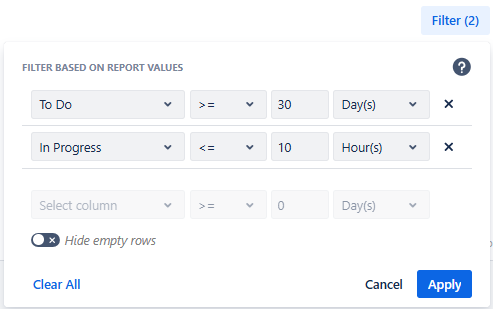 For filters, empty columns (any column that the issue did not visit and displayed with a "-" in the report) are considered as zero (0) so if you define a filter like "To Do > 20", you will only see values greater than 20 and will not see empty values. But if you define a filter like "To Do < 20", you will see values smaller than 20 and you will also see empty values. If you want to exclude empty values, you can define another filter for the same column that goes like "To Do > 0" .