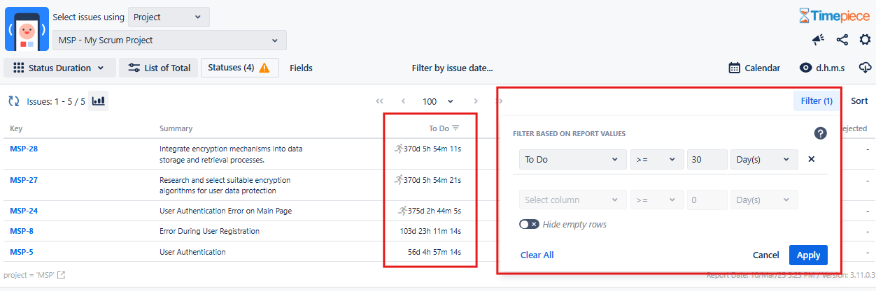 - If no statuses are selected in Status panel, all statuses in your Jira will be listed here for filtering. If you select a status that is not present in the report output, the filter will have no effect.