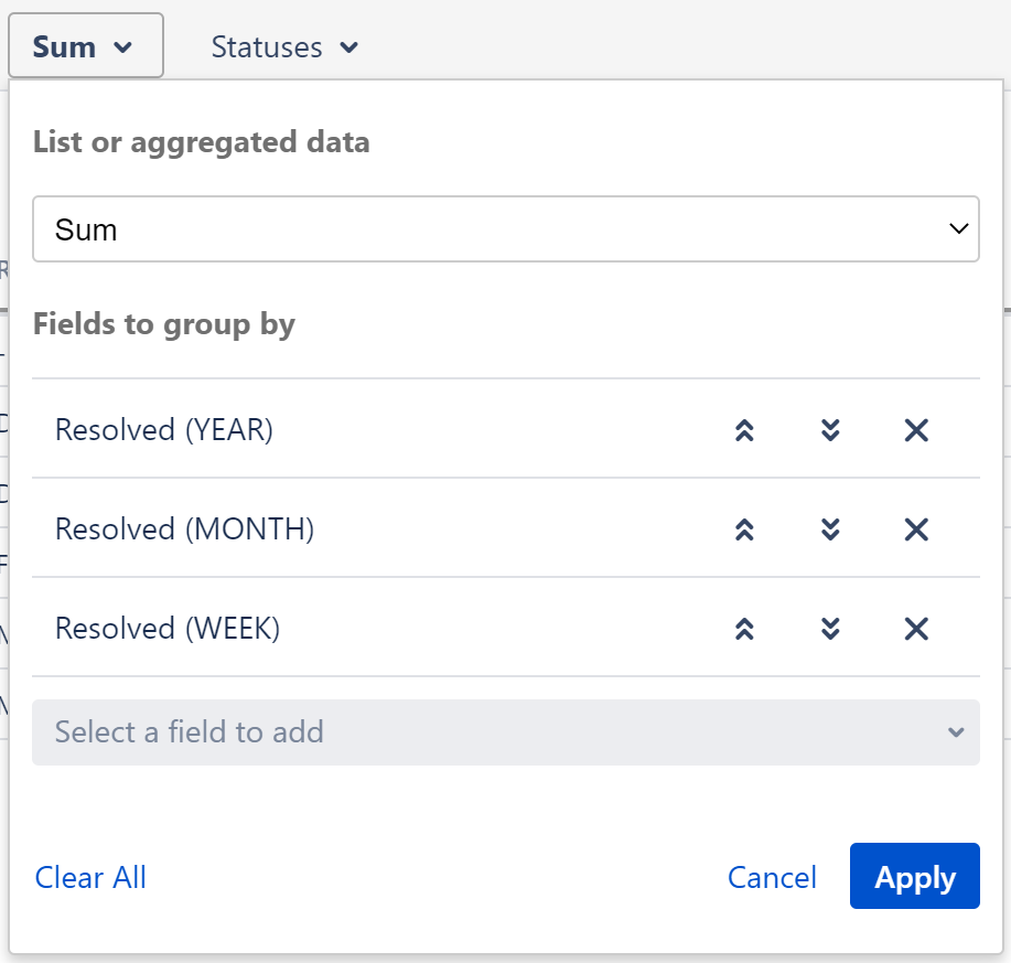 - Select the project in which the issues reside (or set any other filter to get the issues to report on).