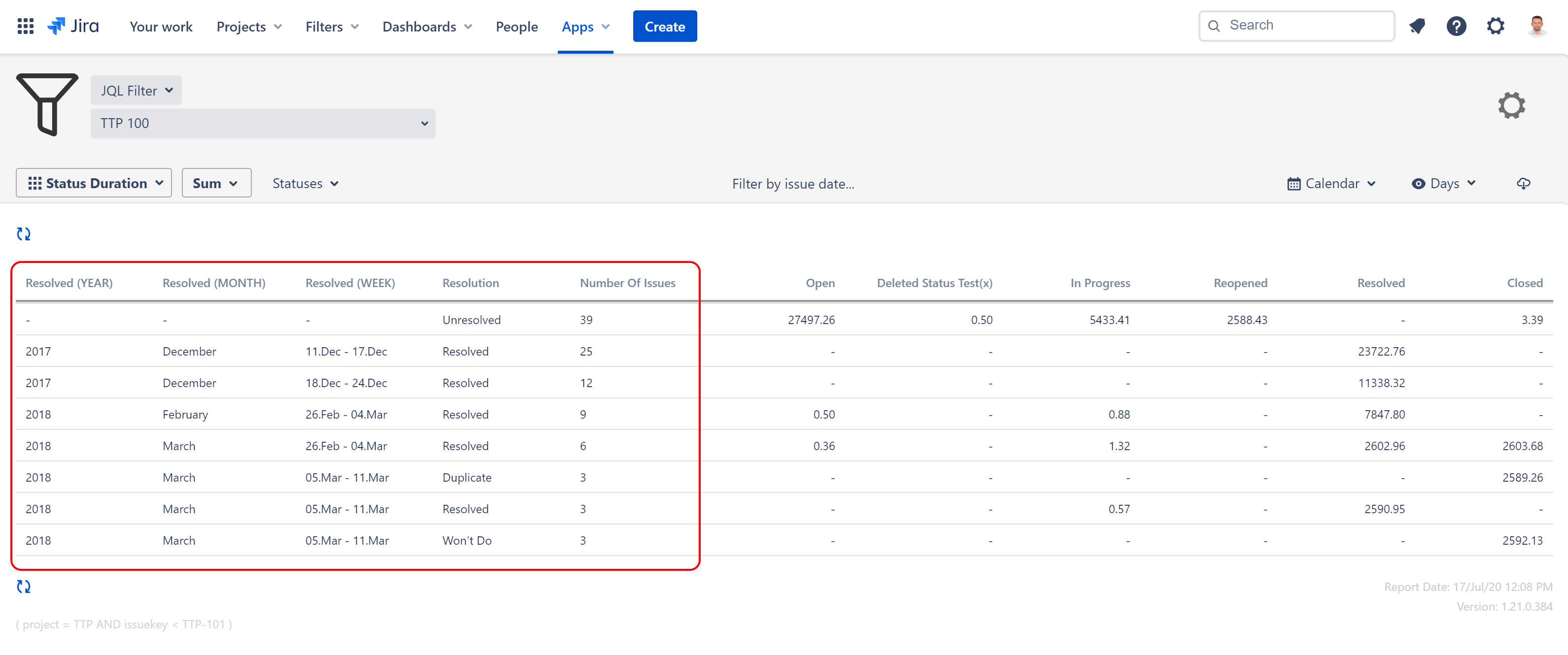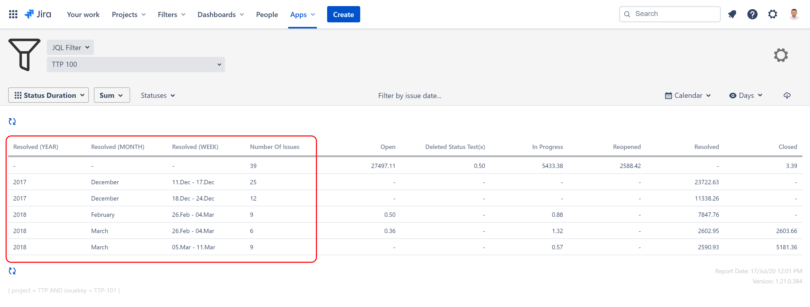 The leftmost columns in the report will show the resolution times of issues grouped by YEAR, MONTH, WEEK and the number of issues that were resolved in that time period.