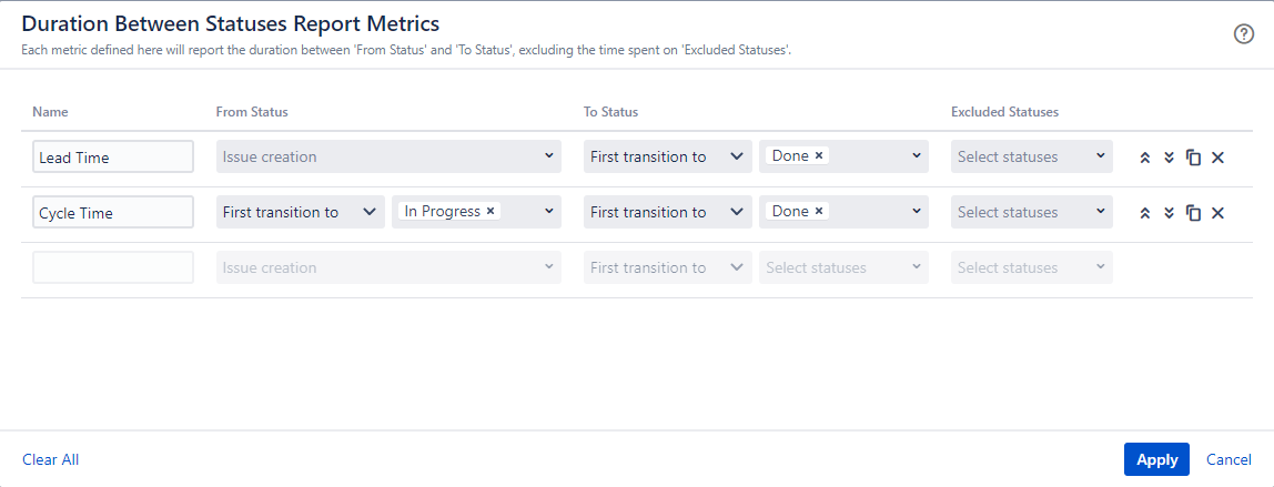 The report will show columns for Lead Time and Cycle Time, along with the other statuses you selected.