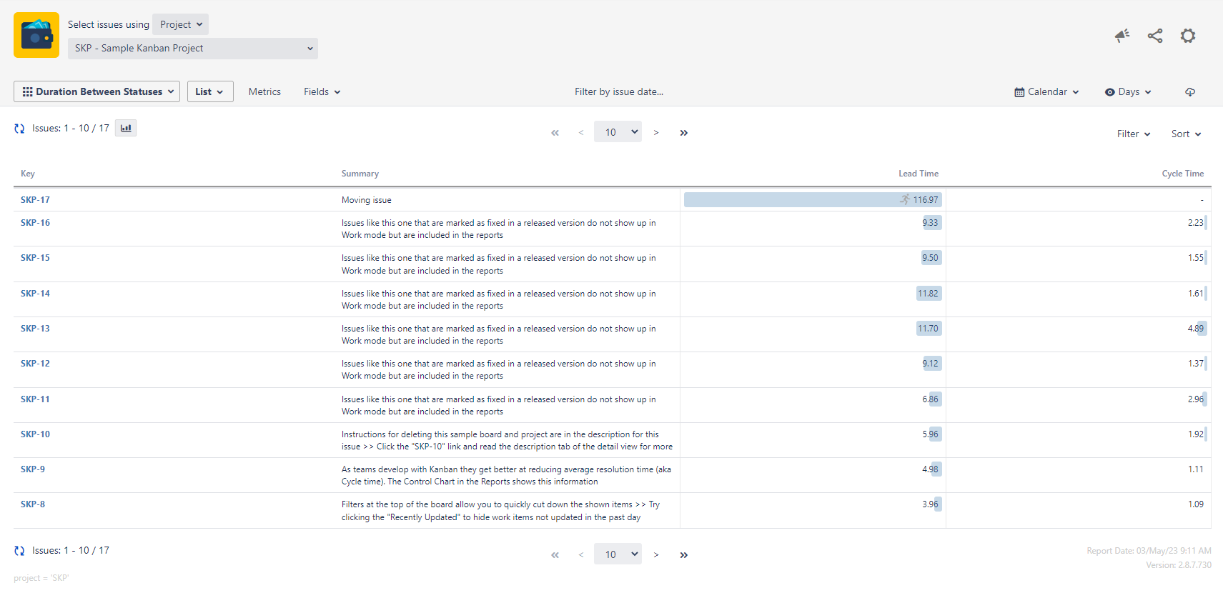 The report will show a column for Cycle Time, along with the columns for other metrics you defined.