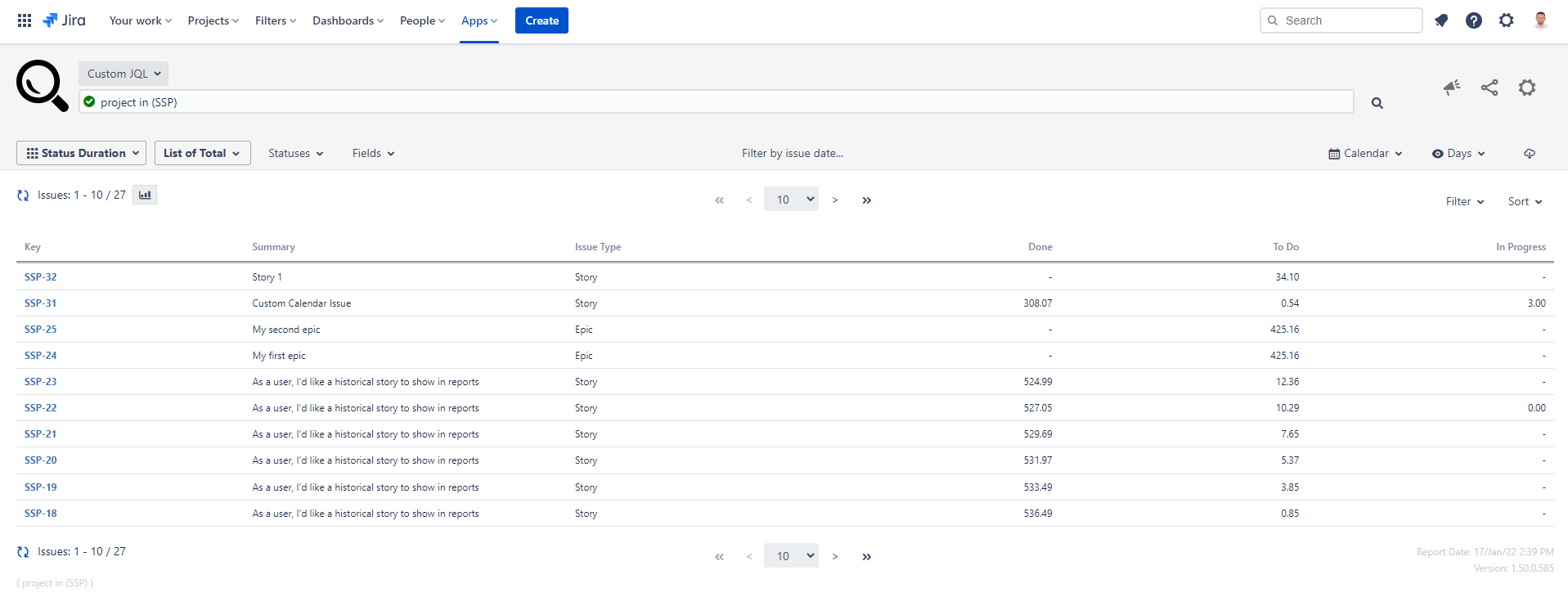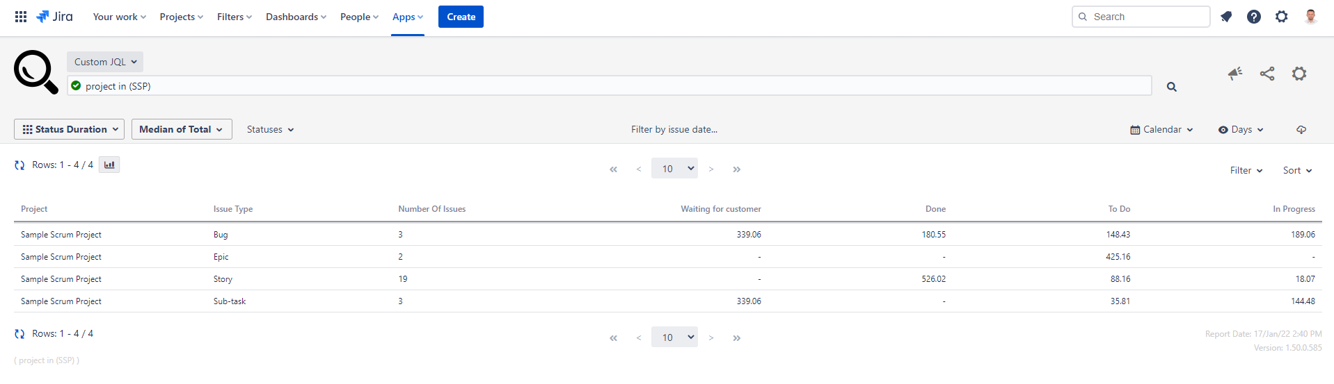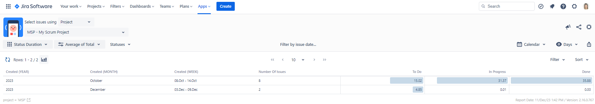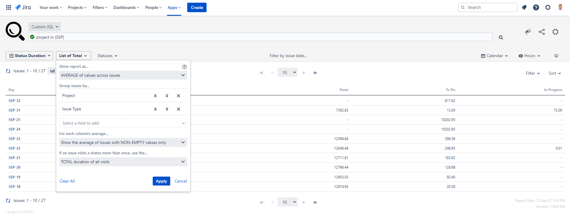 This means when the NON-EMPTY option is selected, the average of a consolidated column will most likely NOT be equal to the sum of averages of all statuses under it. (If all issues have a value for all statuses then it will be. If there is at least one empty value in the report, it won't be.)