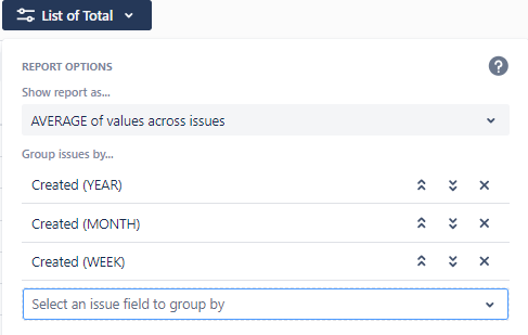 The Group By selection (with the title "Group issues by...") allows you to select and order issue fields for grouping. The aggregated values displayed on screen will be grouped by the fields you pick.