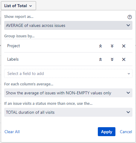 For example if you don't select and fields for group by when getting an Average report, the report will show you the overall average for all issues in the report. If you select the Issue Type field as the group by field for an average report, the issues in the report will be grouped by Issue Type and the report will show the average values for each issue type. The output will have a separate row for each issue type.