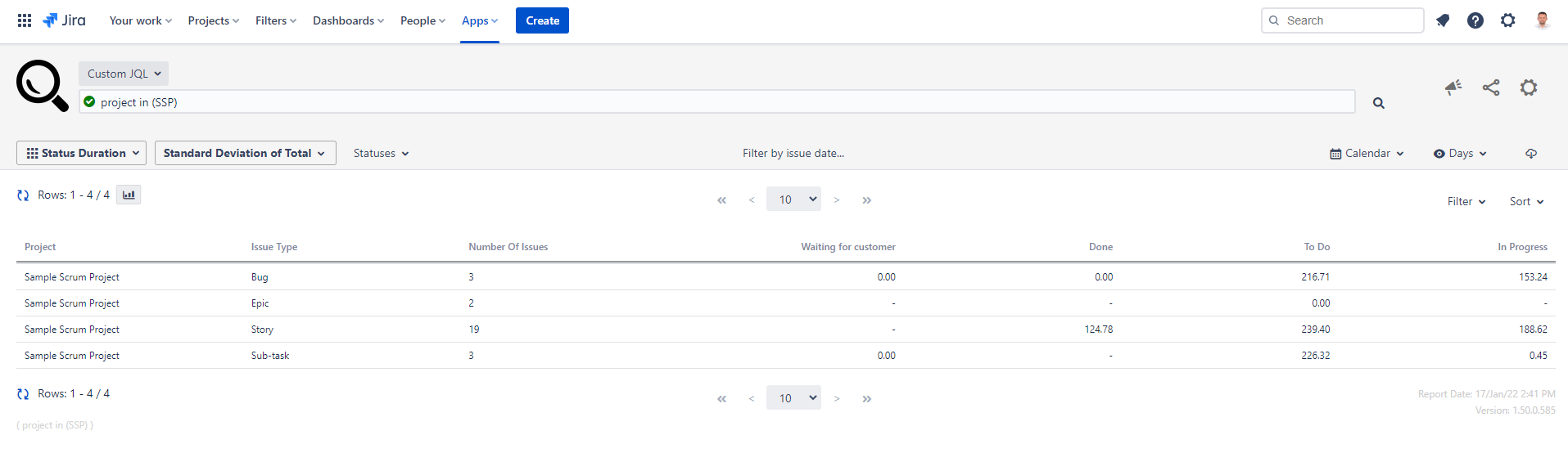 For Aggregate Reports (Average, Sum, Median, Standard Deviation), you can drill-down on each row and see the details of issues that make up that aggregate row. See Drill Down page for details.