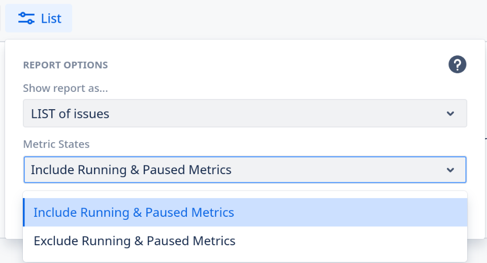 The default option, Include Running & Paused Metrics, shows you the full picture by including metrics in all states. This setting is useful when you need a complete snapshot of all work, both ongoing and completed.