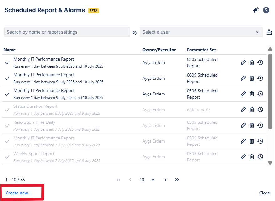 When you click Scheduled Reports & Alarms icon on the app's main page, you can access list of all Scheduled Reports accessible to the user. Key information displayed for each report includes its name, designated Owner, associated parameter set, and schedule frequency.