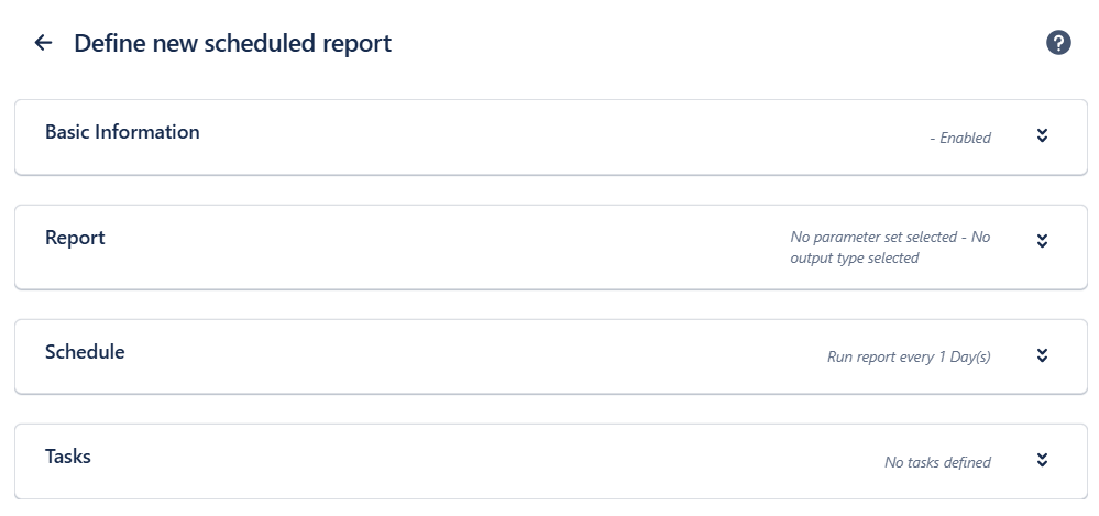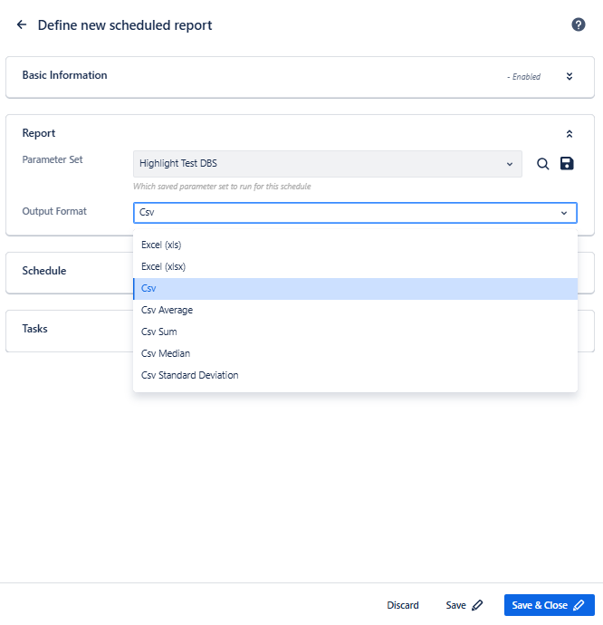 The Create New screen consists of four sections: Basic Information, Report, Schedule, and Tasks.