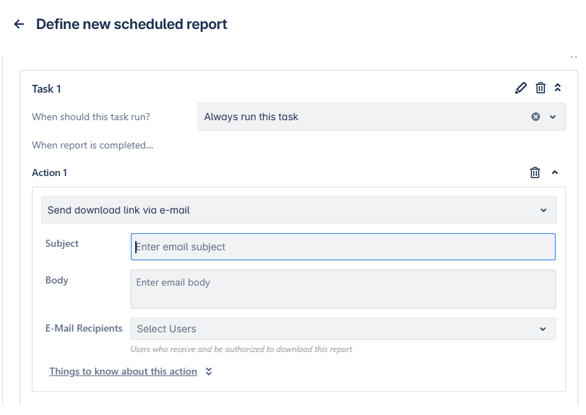 This action allows you to send the generated Scheduled Report's download link as an e-mail to a group of preconfigured users.
