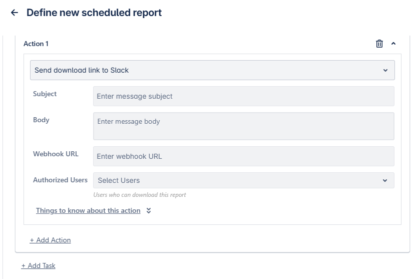 This action allows you to send the generated Scheduled Report's download link as a message to a Slack channel.