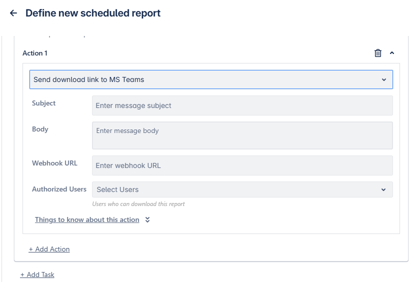 This action allows you to send the generated Scheduled Report's download link as a message to MS Team workspace/channel. To do that, you need to create incoming webhook to Teams. To learn more about MS Teams Webhook, click here.
