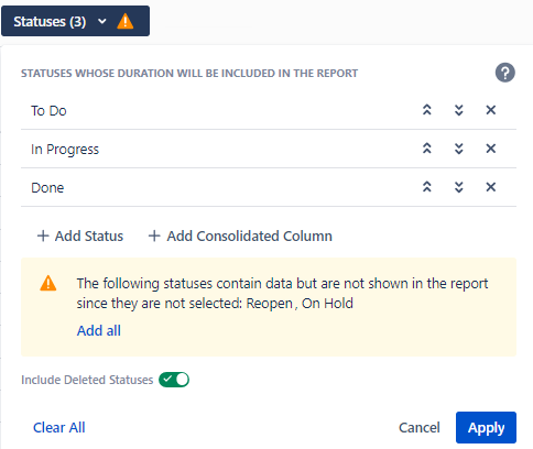 For Status Time, Status Count and Date reports, the selection directly sets the columns shown in the report. For Transition Count report, transitions that originate from or end up in a selected status is included in the report.