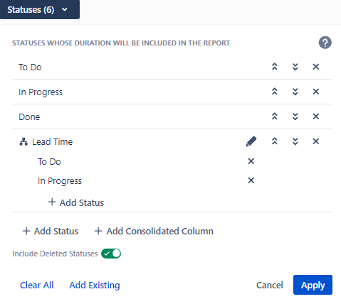 A Consolidated Column will display the sum of a group of statuses as a single column. It most often used to measure metrics like Lead Time, Cycle Time, etc.