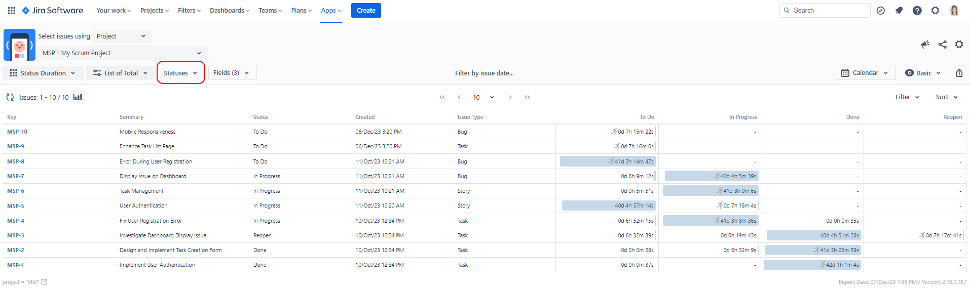 For Assignee Time reports, the report output shows assignee names as columns but the status selection, once again, defines the durations of which statuses to include in the report.