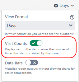 An issue might have visited a status multiple times. While reporting on the durations of those visits, it is often useful to also see how many times an issue visited each status. The Visit Counts option shows or hides the status visit number in the on-screen report output.
