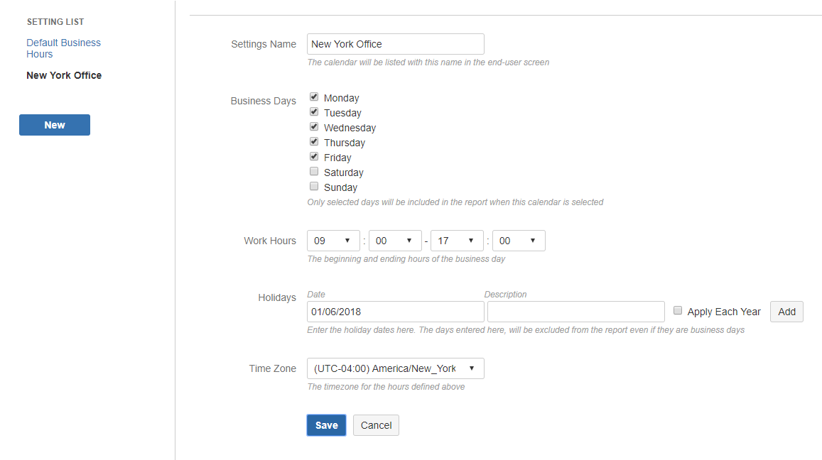 - Use the Business Days section and Work Hours section to define working days and hours for your organization