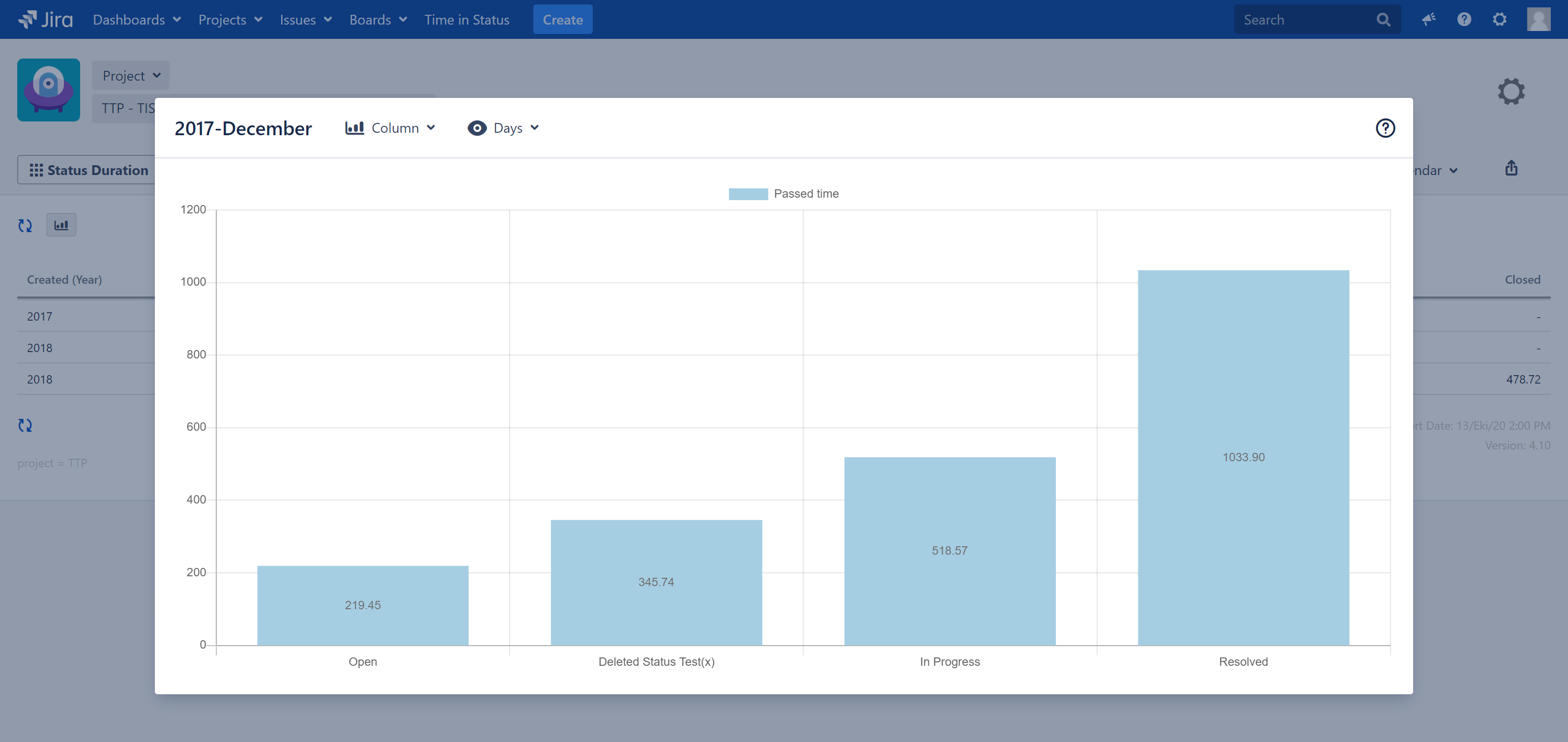 Time in Status report screen shows charts for individual report rows and an overall chart for aggreagated reports.